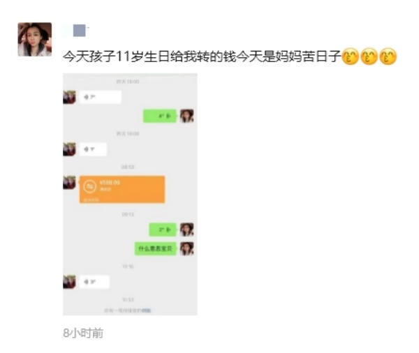 孩子的奶奶给她的孩子发的11岁生日红包,这么推算,2012年的今天孩子出生,怀孕应该是在2012年年初,至于结婚,可能是怀孕前后,这么来看,至少结婚两次了,2015年有可能是第二次婚姻了。她的姓氏不是常见的姓氏,孩子也是这个姓氏,孩子应该是跟她了。